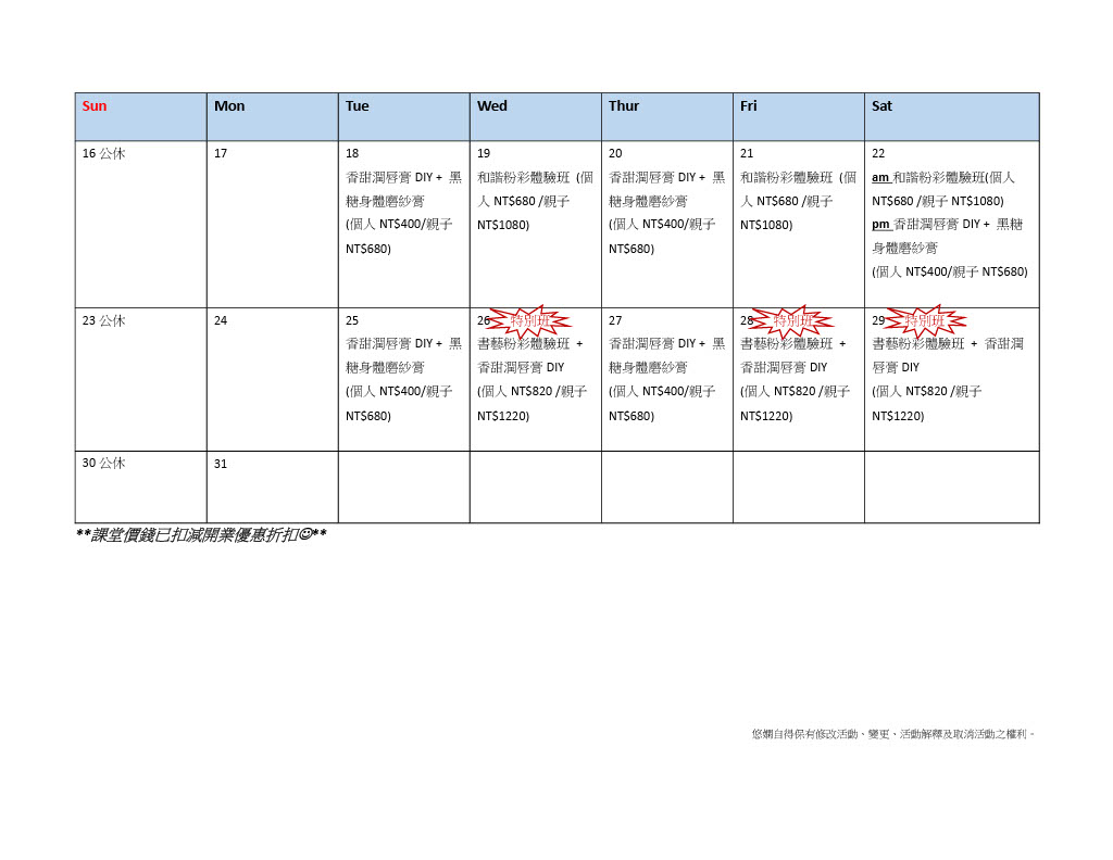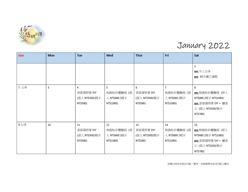 1月份的課程時間表